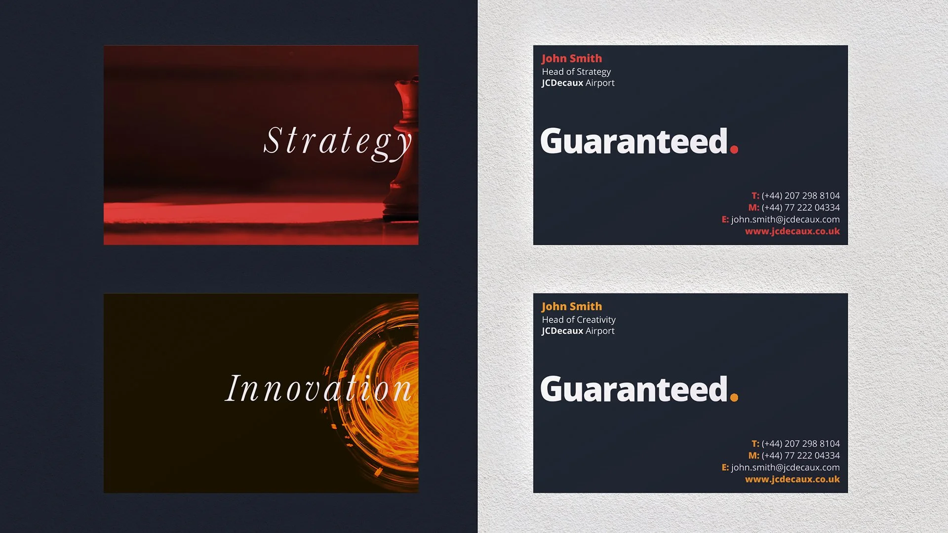 JCDecaux used the idea of the juxtaposition of the two words: Possibility and Guaranteed ’Possibility’ being an elegant and fluid form creating more playful impression, suggesting that anything is possible. ’Guaranteed’ is on the other side of the spectrum. It’s bold, powerful and solid, giving a sense of security and safety. The main message: Not only do we have an endless amount of possibilities for our customers but we can guarantee them.